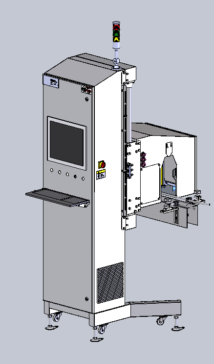 该产品安装在贴标机后端,通过光电触发装动态获取运行中的瓶体的标贴图像,并将图像送至主机标贴算法处理,识别标贴缺陷情况,根据标贴缺陷类型将处理信号发给PLC,PLC根据结果对NG产品进行剔除操作。